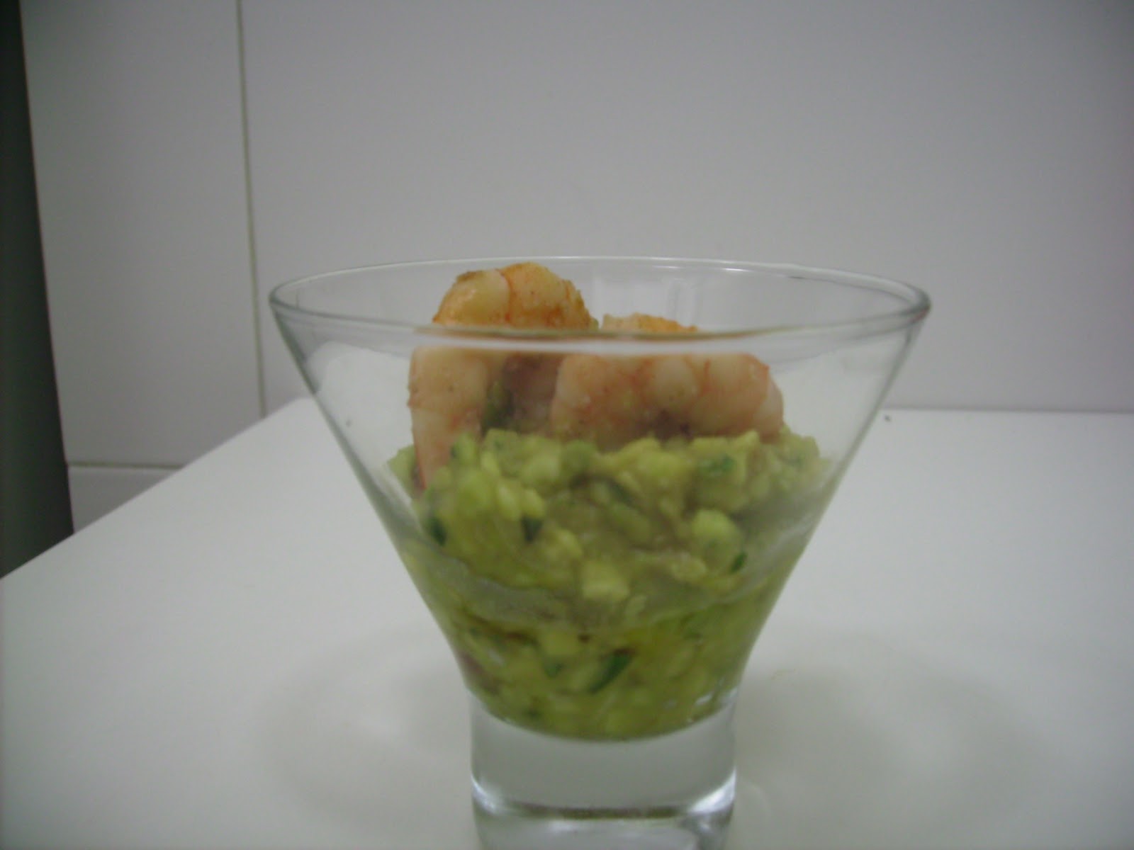 Numa tacinha, colocar o guacamole e os camarões grelhados por cima.